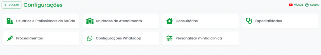 No menu principal, encontre e clique no card Configurações. Você será direcionado para uma página com diversas opções, como Usuários e Profissionais de Saúde, Unidades de Atendimento e Personalizar Minha Clínica, que é o ponto de partida para todas as personalizações da sua clínica.