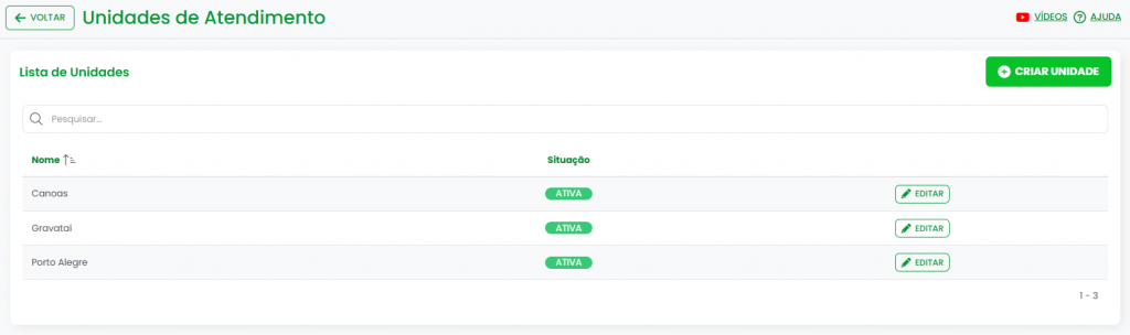 - A tela Unidades de Atendimento será exibida, mostrando uma lista das unidades já cadastradas