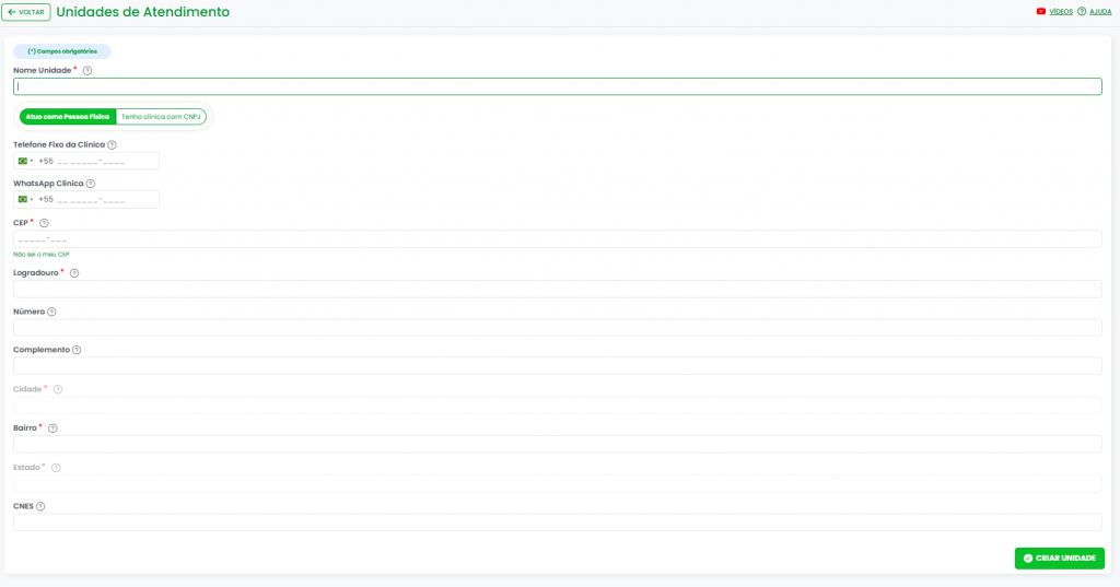 - Após preencher todos os campos, clique no botão Criar Unidade para salvar.