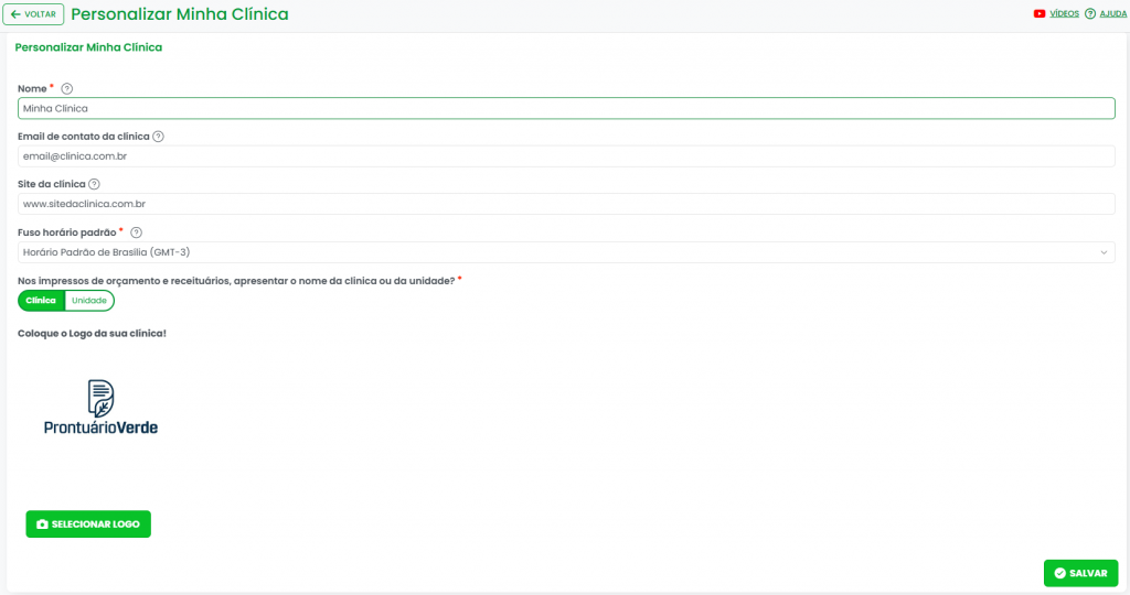 - Você também pode adicionar o Logo da sua clínica clicando em Selecionar logo.