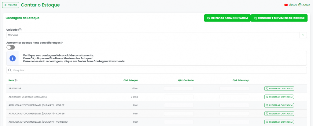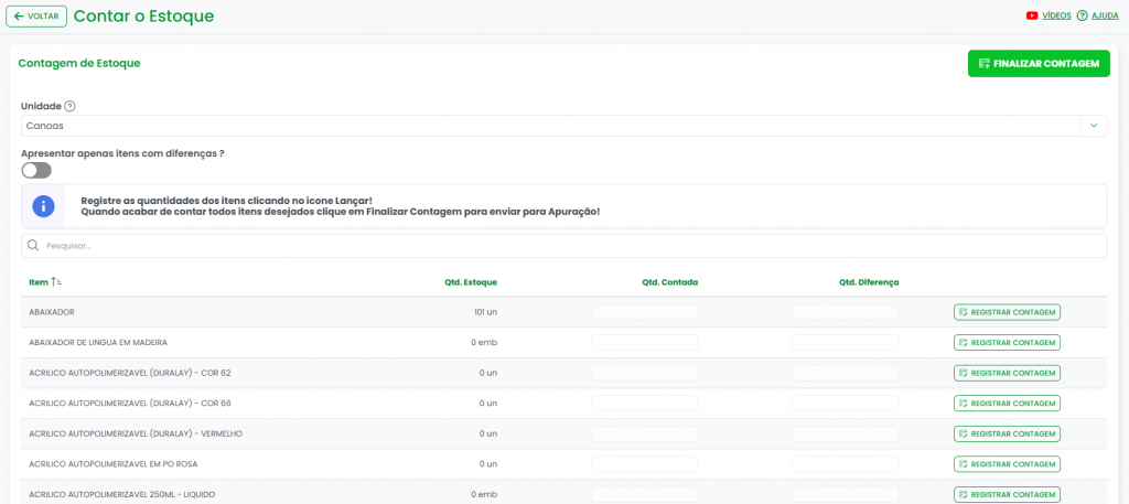 - Utilize o botão REGISTRAR CONTAGEM para salvar a quantidade de cada item. Você pode fazer a contagem de poucos itens de cada vez, se preferir.