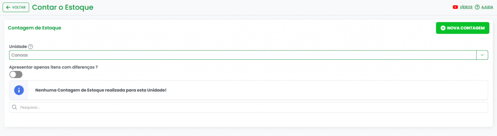 - Caso não haja nenhuma contagem em andamento, o botão + NOVA CONTAGEM estará disponível no canto superior direito. Clique nele para começar.