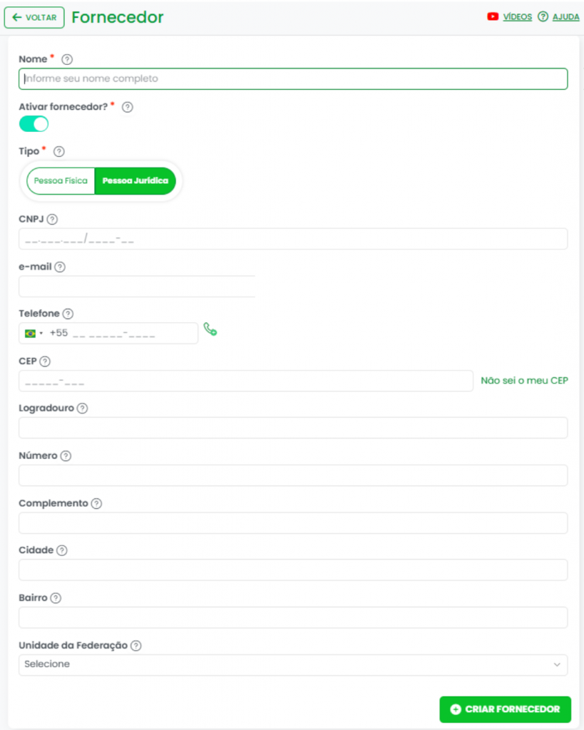 - Tipo: Selecione se o fornecedor é uma Pessoa Física ou Pessoa Jurídica, o que ajustará os campos de identificação (CPF ou CNPJ).