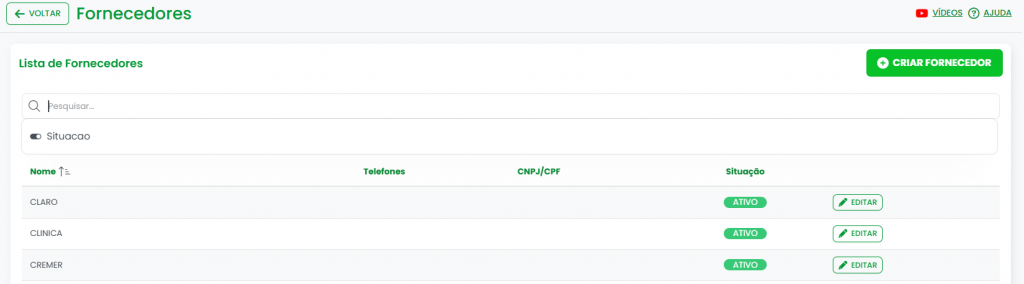 - Filtros de Pesquisa: Utilize a barra de pesquisa para encontrar um fornecedor pelo nome. Há também um filtro de Situação para visualizar apenas os fornecedores ativos ou inativos.
