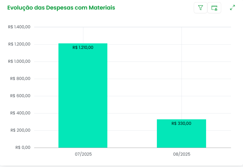 - Evolução das Despesas com Materiais: Um gráfico de linha que mostra a variação dos seus gastos ao longo do tempo.