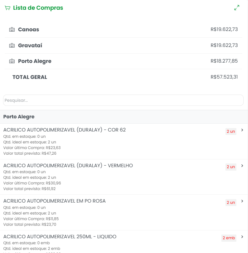 Esta seção é uma prévia rápida da sua lista de compras. Ela exibe os itens que precisam ser reabastecidos, mostrando a Qtd. em estoque atual, a Qtd. ideal em estoque e o Valor total previsto para a compra. É uma maneira rápida de checar as necessidades de reabastecimento.