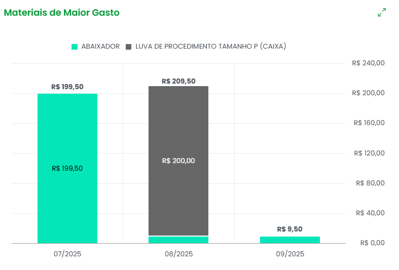 Este gráfico de barras ou linha (dependendo da sua preferência) mostra a variação total dos seus gastos com materiais ao longo do tempo. Ele é crucial para acompanhar a performance financeira do seu estoque.