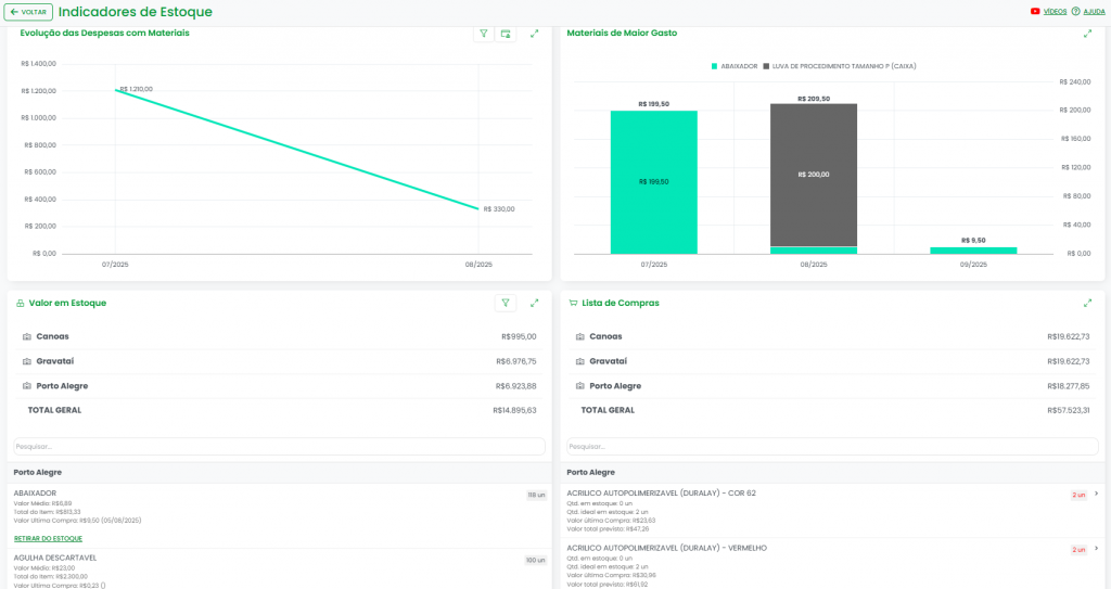 Esta seção fornece uma visão financeira do seu estoque, mostrando o valor total de itens armazenados em cada unidade da sua clínica.