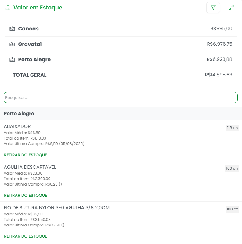 - Valor em Estoque: Uma lista que mostra o valor total do seu estoque em cada unidade, com um resumo do valor geral.