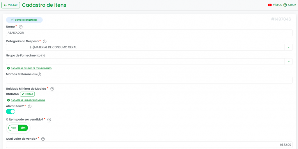 - Unidade Mínima de Medida: Este é o padrão de consumo e movimentação interna do item (ex: UNIDADE).