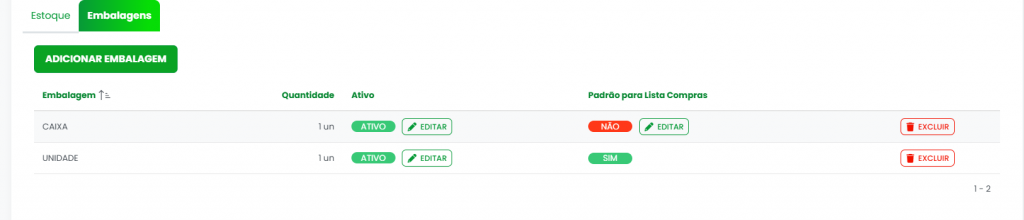 - Adicionar Embalagem: Utilize o botão ADICIONAR EMBALAGEM para cadastrar novos tipos.