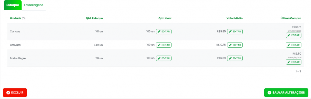 - Botões de Ação: Utilize os botões EDITAR para ajustar as quantidades e o botão SALVAR ALTERAÇÕES para registrar as mudanças.