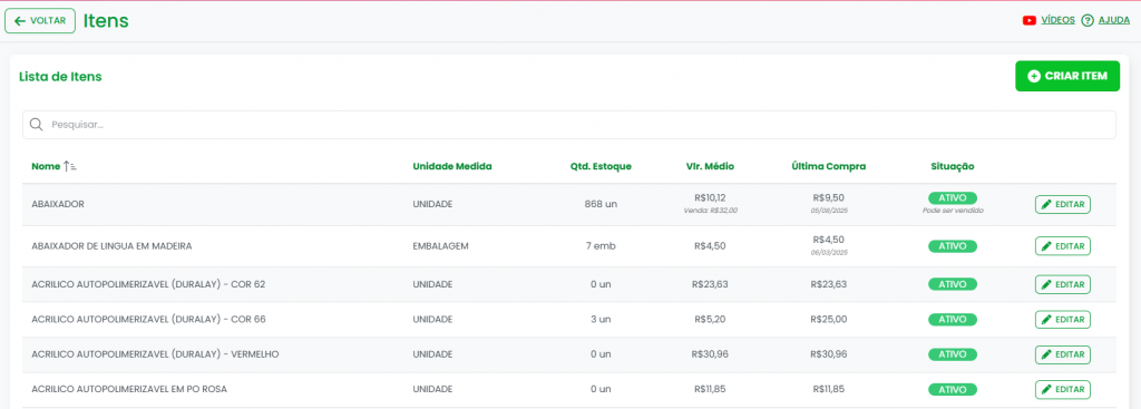 - Situação: Indica se o item está ATIVO e pode ser utilizado ou vendido, ou se está inativo.