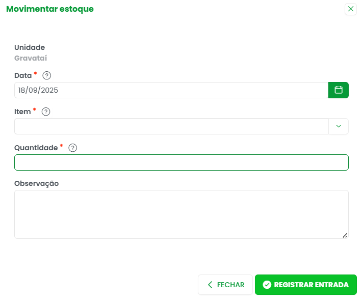 - O formulário solicita a Data, o Item, a Quantidade a ser adicionada e um campo de Observação.