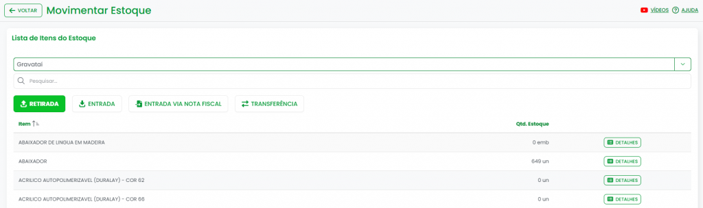 - Abaixo, a lista de itens da unidade exibe o Nome, a Qtd. Estoque atual e um botão DETALHES para ver o histórico de movimentações do item.