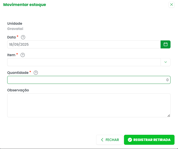 - O formulário pede a Data, o Item, a Quantidade a ser retirada e um campo para Observação.