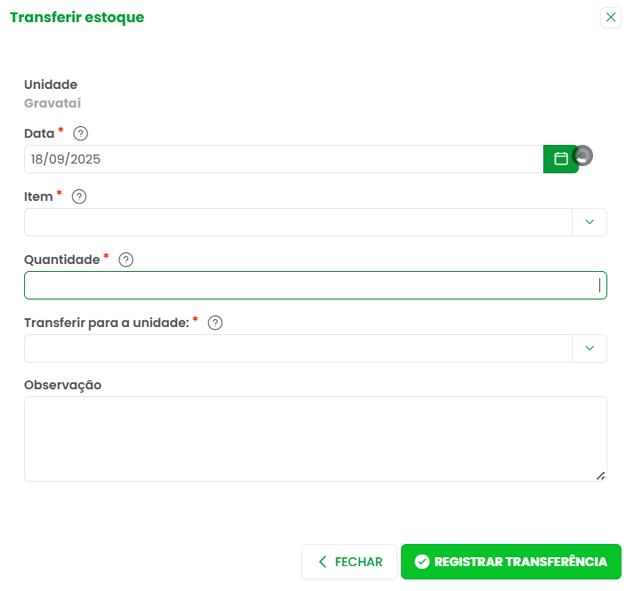 - Além dos campos de Data, Item, e Quantidade, este formulário tem um campo adicional para você selecionar a unidade de destino (Transferir para a unidade:).