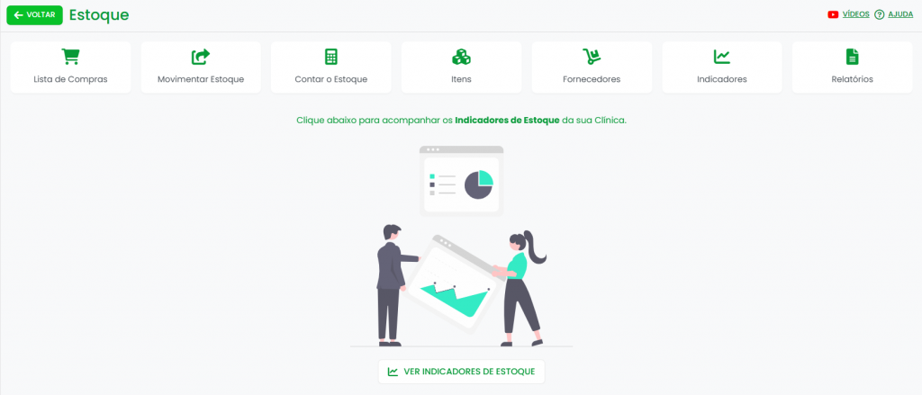 - Indicadores: Esta é uma das funcionalidades mais poderosas! Clique aqui para visualizar gráficos e métricas que fornecem uma visão clara da performance do seu estoque. Entenda padrões de consumo, identifique itens de alta e baixa rotatividade e tome decisões estratégicas.