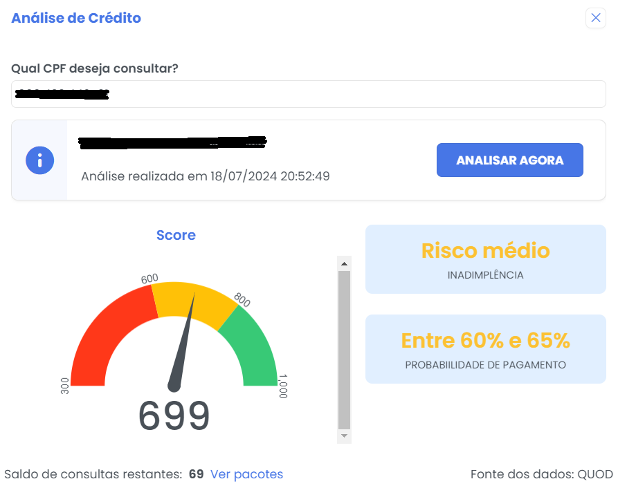 O sistema mostra um score de crédito com base nas informações obtidas a partir da consulta em bases de dados de nossos parceiros. Esse score é um valor que avalia a saúde financeira do cliente e a probabilidade de ele pagar suas dívidas em dia.