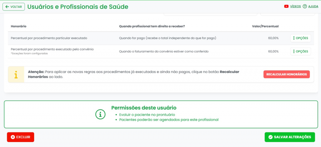 Configurações dos profissionais: Realizadas no cadastro do profissional, é com base nelas que o sistema irá calcular os honorários corretamente.