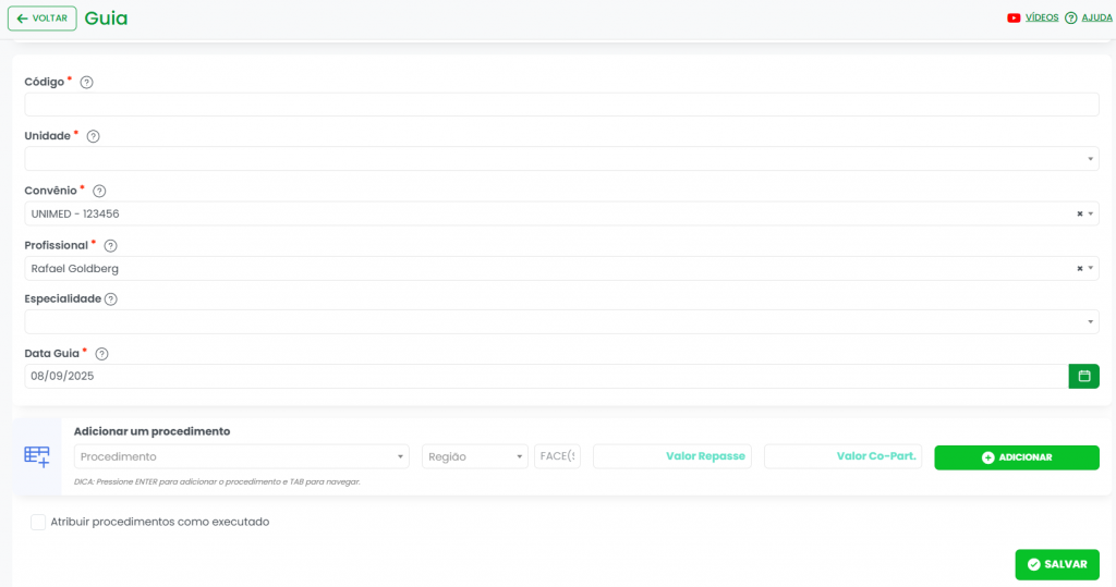 Para finalizar o cadastro da guia, clique no botão verde “Salvar”. Com a guia salva, você poderá seguir para as próximas etapas.