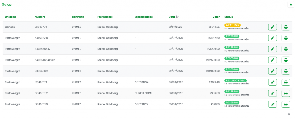- Status: Indica a situação da guia (“A faturar”, “Recebido”, “Recurso pago”).