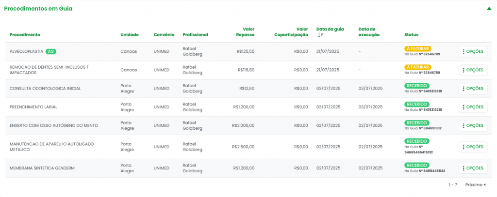 - Status: Indica a situação do procedimento (“A faturar” ou “Recebido”).