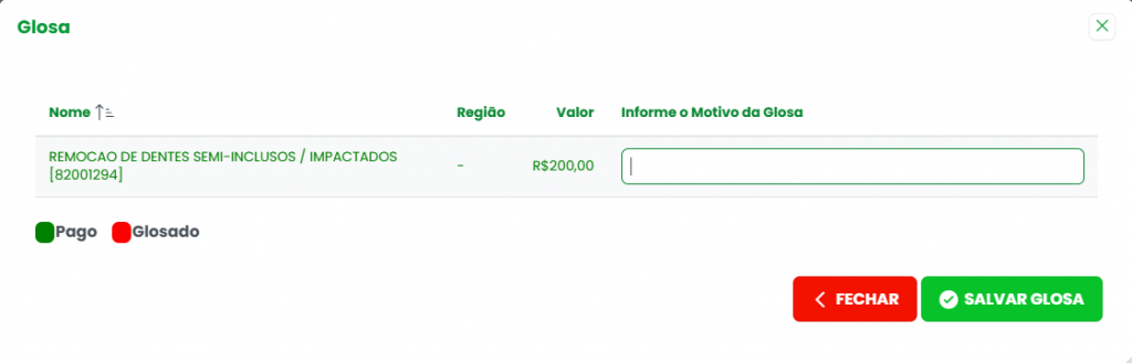 Após preencher as informações, clique em “Salvar Glosa”. O valor será atualizado na coluna “Glosa” da tabela.