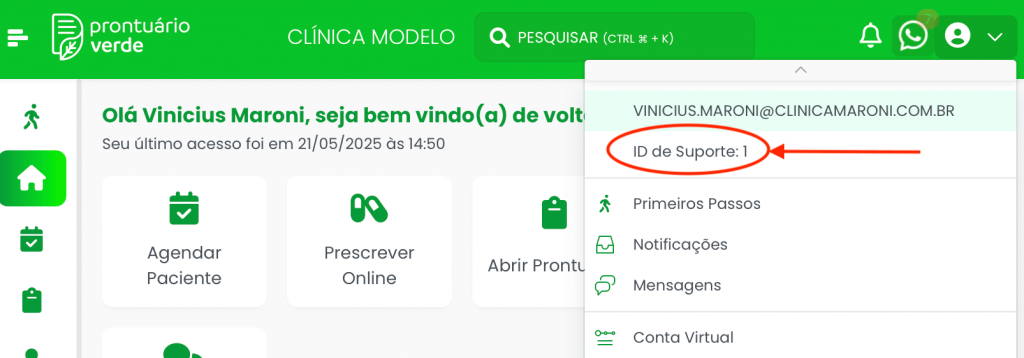 Você deverá enviar os seus dados para importar@prontuarioverde.com.br a partir do e-mail do administrador da conta do Prontuário Verde. No assunto do e-mail inclua a palavra “Migração de Dados” e o seu “ID de Suporte” que poderá ser encontrado acessando o Prontuário Verde e clicando sobre o ícone do perfil no canto superior direito como na imagem abaixo 👇