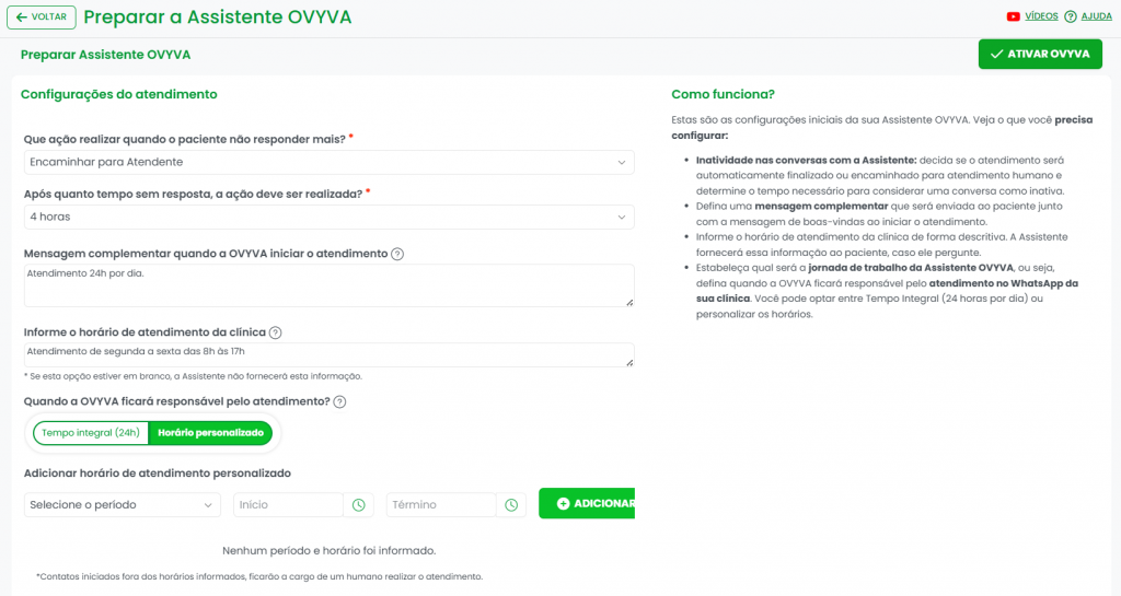 - Informe o horário de atendimento da clínica: Descreva de forma textual os horários de funcionamento da clínica para que a OVYVA possa informar os pacientes.