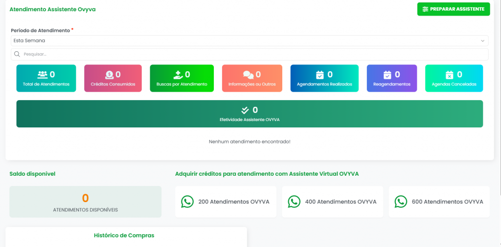 Você pode recarregar seus créditos de atendimento na parte inferior do painel principal da OVYVA, escolhendo um dos pacotes de 200, 400 ou 600 atendimentos.