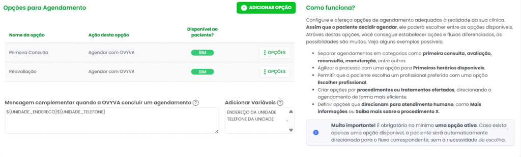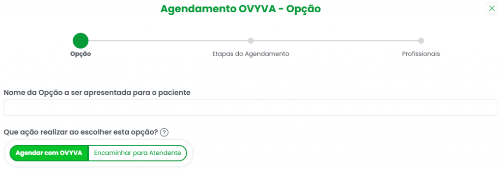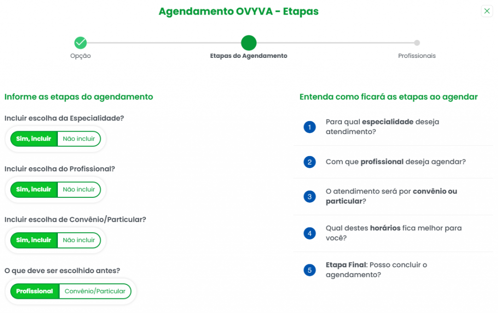 - Escolha se a OVYVA deve incluir a seleção de especialidade, profissional ou convênio/particular durante o agendamento.