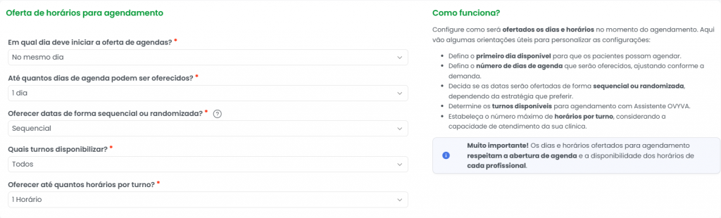 - Oferecer até quantos horários por turno?: Defina o número máximo (até cinco horários) de opções de horário que a OVYVA irá apresentar ao paciente por turno.