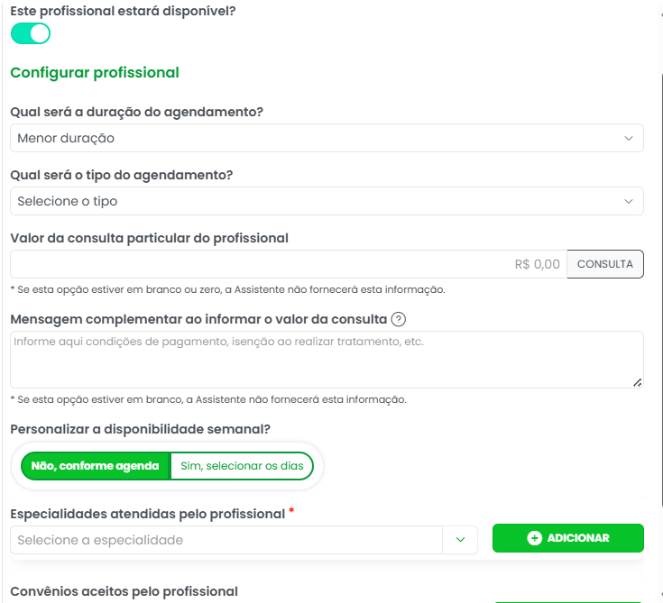 - Importante: Certifique-se de que o profissional desejado esteja com a disponibilidade “Ativo” e devidamente configurado.