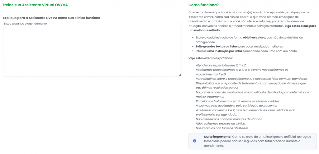 Da mesma forma que você ensinaria um(a) novo(a) recepcionista, explique para a Agente de IA OVYVA como sua clínica opera: O que você oferece, limitações de atendimento e também o que você não oferece. Informe, por exemplo, áreas de atuação, convênios aceitos e procedimentos e serviços ofertados. Siga estas dicas para um melhor resultado: