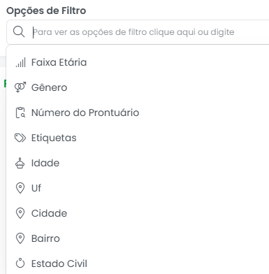 - Bairro: Oferece uma segmentação ainda mais detalhada, permitindo filtrar pacientes por “Bairro”. Muito útil para ações de marketing direcionadas a áreas próximas à clínica.