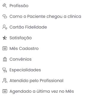 - Profissão: Permite filtrar pacientes por sua “Profissão”. Pode ser útil para clínicas que atendem a um nicho profissional específico ou para entender o perfil socioeconômico da sua base.