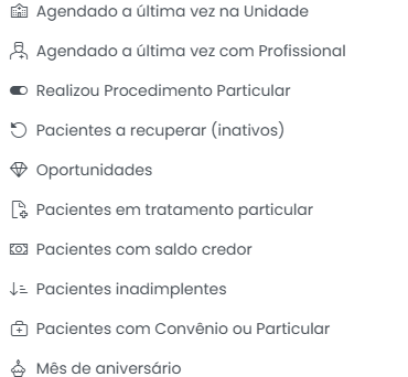 - Pacientes a recuperar (inativos): Filtra pacientes que são considerados inativos (não retornam há um determinado período). Crucial para campanhas de reengajamento.