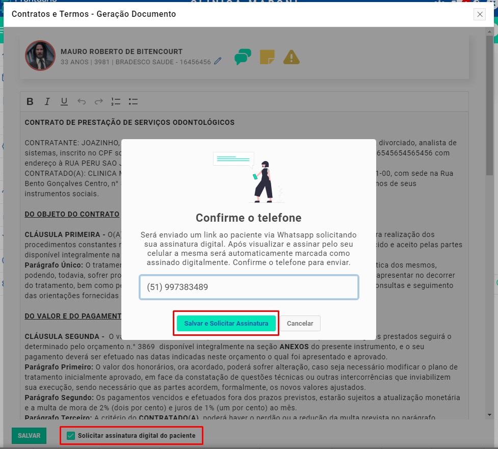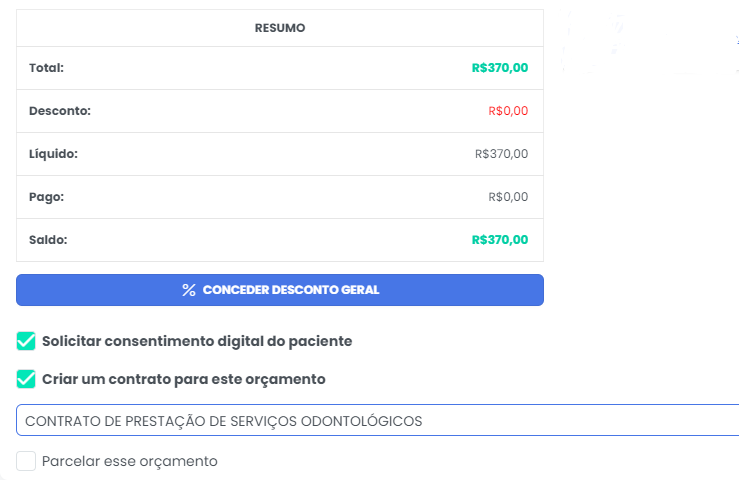 - Clique na caixa “Solicitar consentimento digital do paciente” e em “Criar um contrato para este orçamento“