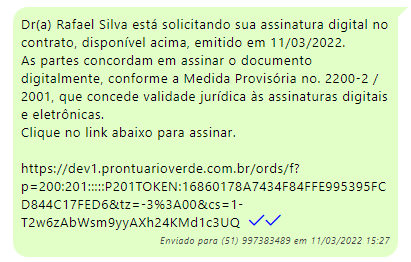 Para o paciente o processo é simples, ele receberá no seu WhatsApp conforme o exemplo abaixo o PDF e um link na qual ele irá assinar digitalmente.