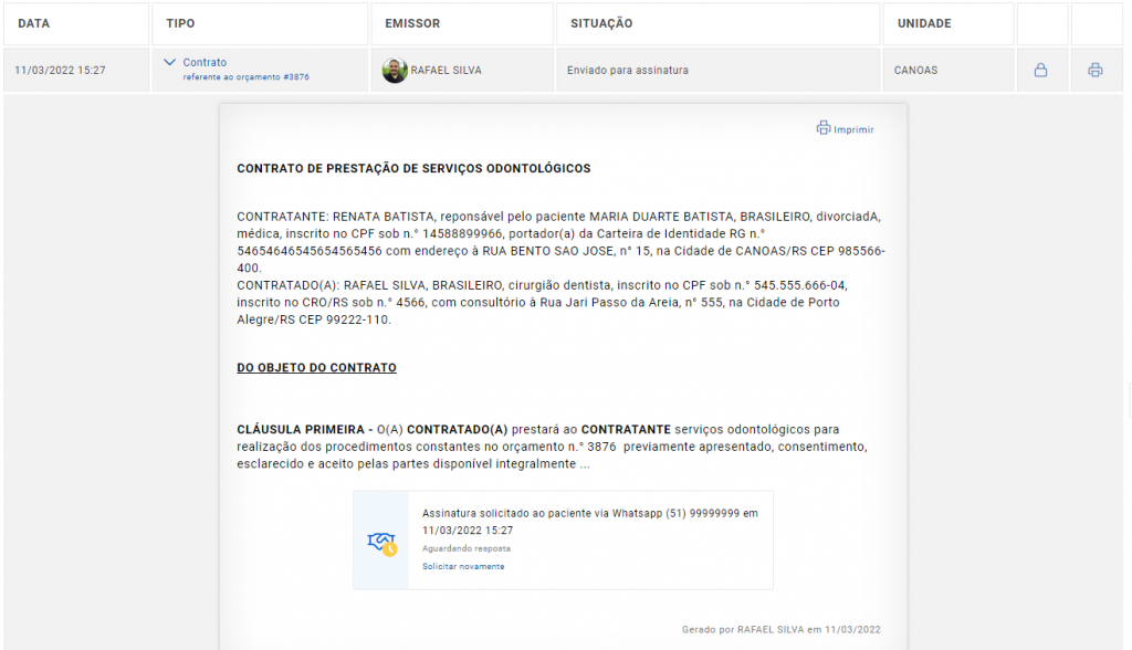 - Quando um orçamento for alterado, todos os contratos não assinados serão cancelados, mantendo-se apenas o ultimo gerado. Caso este último contrato esteja em processo de assinatura será necessário solicitar novamente a assinatura ao paciente pois o link anterior perderá a validade.