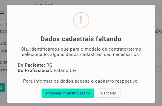 - Caso o sistema identifique algum informação cadastral necessária para o documento que estiver sendo gerado, ele irá emitir o aviso abaixo. Caso esteja tudo certo, nenhum alerta será exibido.