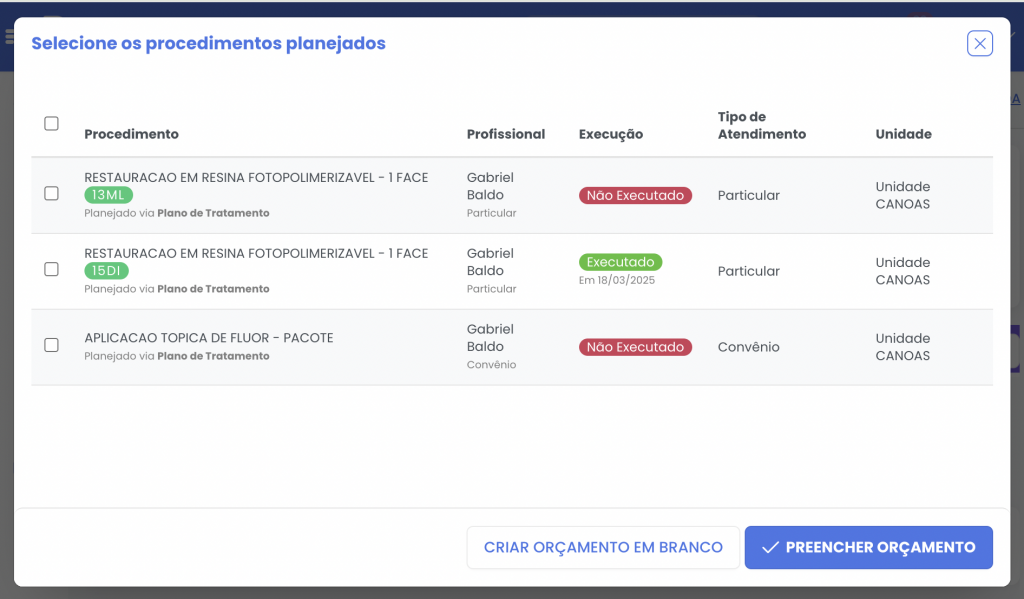 Agora, ao criar um orçamento, uma nova tela abre sugerindo a seleção dos procedimentos de um plano de tratamento existente ou a opção de criar um orçamento do zero. Essa funcionalidade torna a elaboração de orçamentos mais rápida e prática, garantindo mais precisão e comodidade para você e seus pacientes. Na tela, há dois botões: Criar Orçamento em Branco, que abre a tela para informar novos procedimentos, e Preencher Orçamento, que exige a seleção prévia dos procedimentos planejados antes de clicar no botão. Esse recurso agiliza o processo e evita retrabalho.