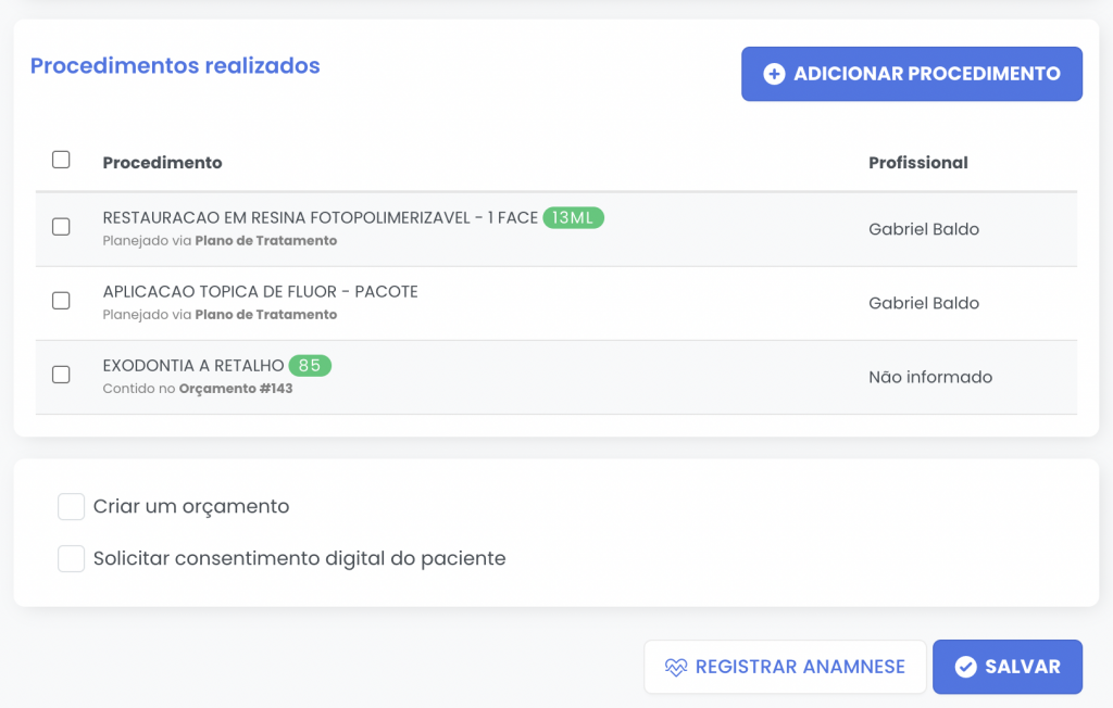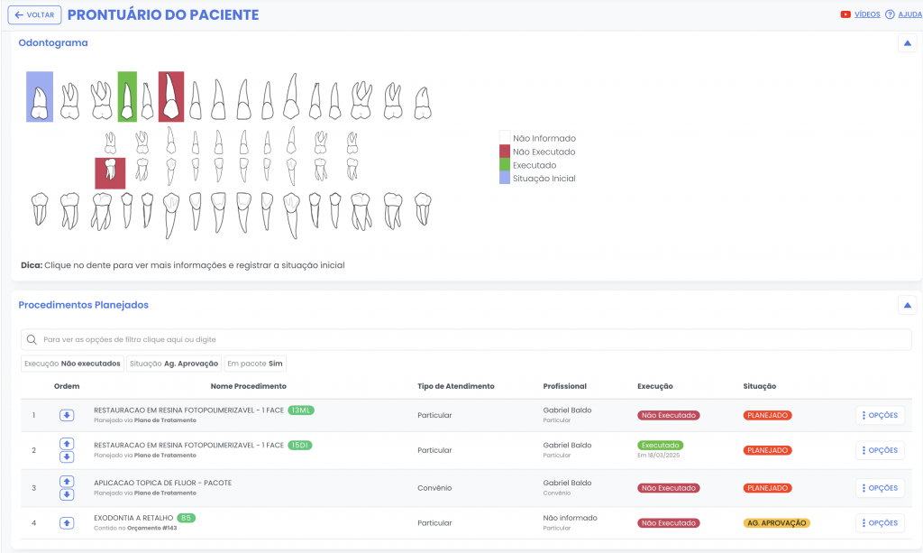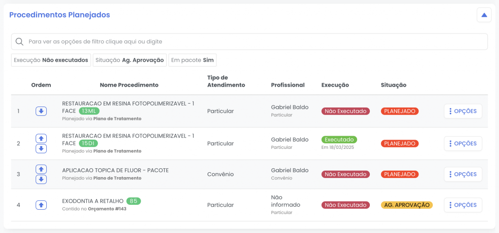 Os procedimentos planejados ficam ainda mais organizados! Você pode visualizar com clareza cada tratamento programado e, caso necessário, reordenar a sequência utilizando as setas de cima e baixo na lista de procedimentos. Além disso, é possível marcar a execução de cada procedimento conforme ele for realizado, integrando automaticamente com o planejamento e os orçamentos.