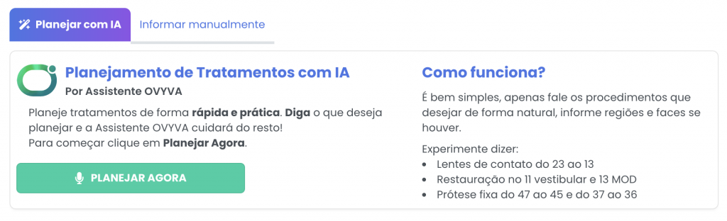 Com a Assistente OVYVA, planejar tratamentos nunca foi tão rápido e intuitivo! Basta ditar os procedimentos desejados de forma natural e a IA cuida do resto. Informe os procedimentos, regiões e faces de forma simples e objetiva.
