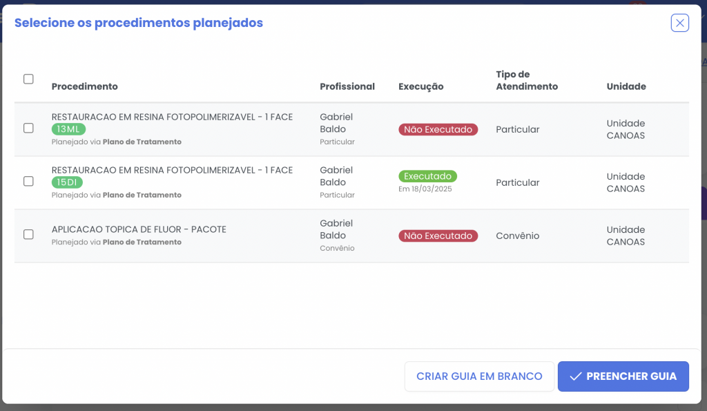Agora, ao criar guias, uma nova tela abre sugerindo a seleção dos procedimentos de um plano de tratamento existente ou a opção de criar um novo orçamento do zero. Isso agiliza o processo, reduzindo o tempo gasto na administração dos procedimentos e garantindo maior praticidade no atendimento. Assim como na criação de orçamentos, a tela conta com dois botões: Criar Guia em Branco, para adicionar procedimentos manualmente, e Preencher Guia, que exige a seleção prévia dos procedimentos planejados antes de ser acionado. Isso simplifica a emissão de guias e torna o fluxo de trabalho ainda mais eficiente.