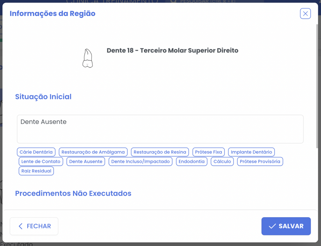 Agora você pode registrar a situação inicial do paciente diretamente no odontograma. Esse recurso permite um acompanhamento mais detalhado da evolução dos tratamentos, facilitando a análise comparativa entre antes e depois. Ao clicar sobre o elemento, você pode informar se o dente está ausente, se há implante dentário, prótese fixa, raiz residual, entre outras condições.