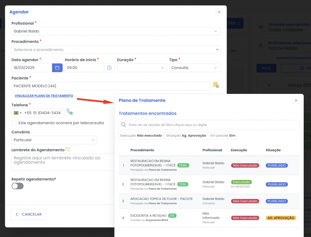 Agora, ao agendar, ficou muito mais fácil visualizar o que o paciente ainda tem pendente. Ao clicar no link “Visualizar Plano de Tratamento” na tela de novo agendamento ou então em “Buscar tratamentos” na tela da agenda, aparecem todos os procedimentos previstos e realizados, permitindo que a secretária compreenda rapidamente o motivo do agendamento, o profissional responsável e os tempos de consulta, entre outras informações importantes sem precisar abrir o prontuário do paciente.