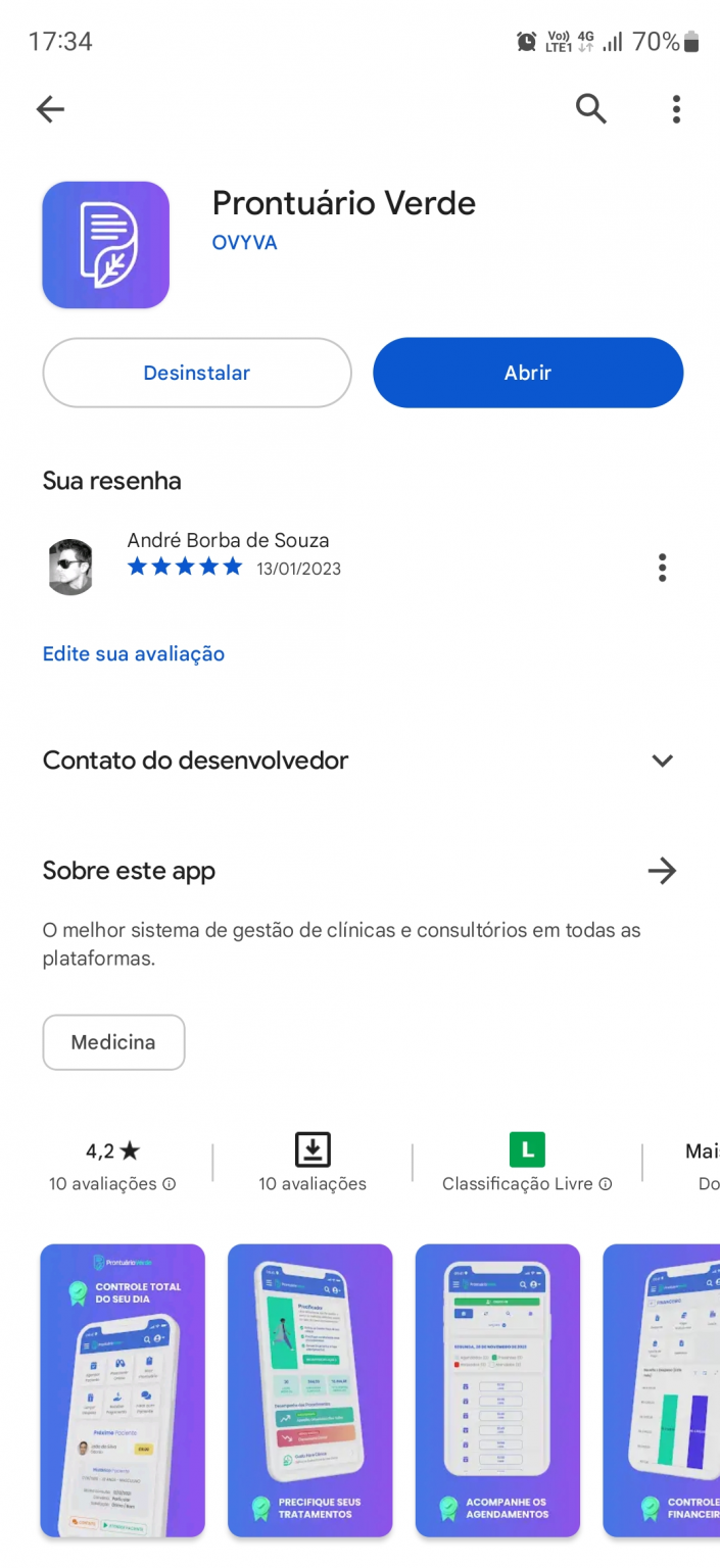 - Ou, se preferir, clique no link abaixo para ser direcionado automaticamente para a página de download: https://play.google.com/store/apps/details?id=br.com.ovyva.prontuarioverde.app