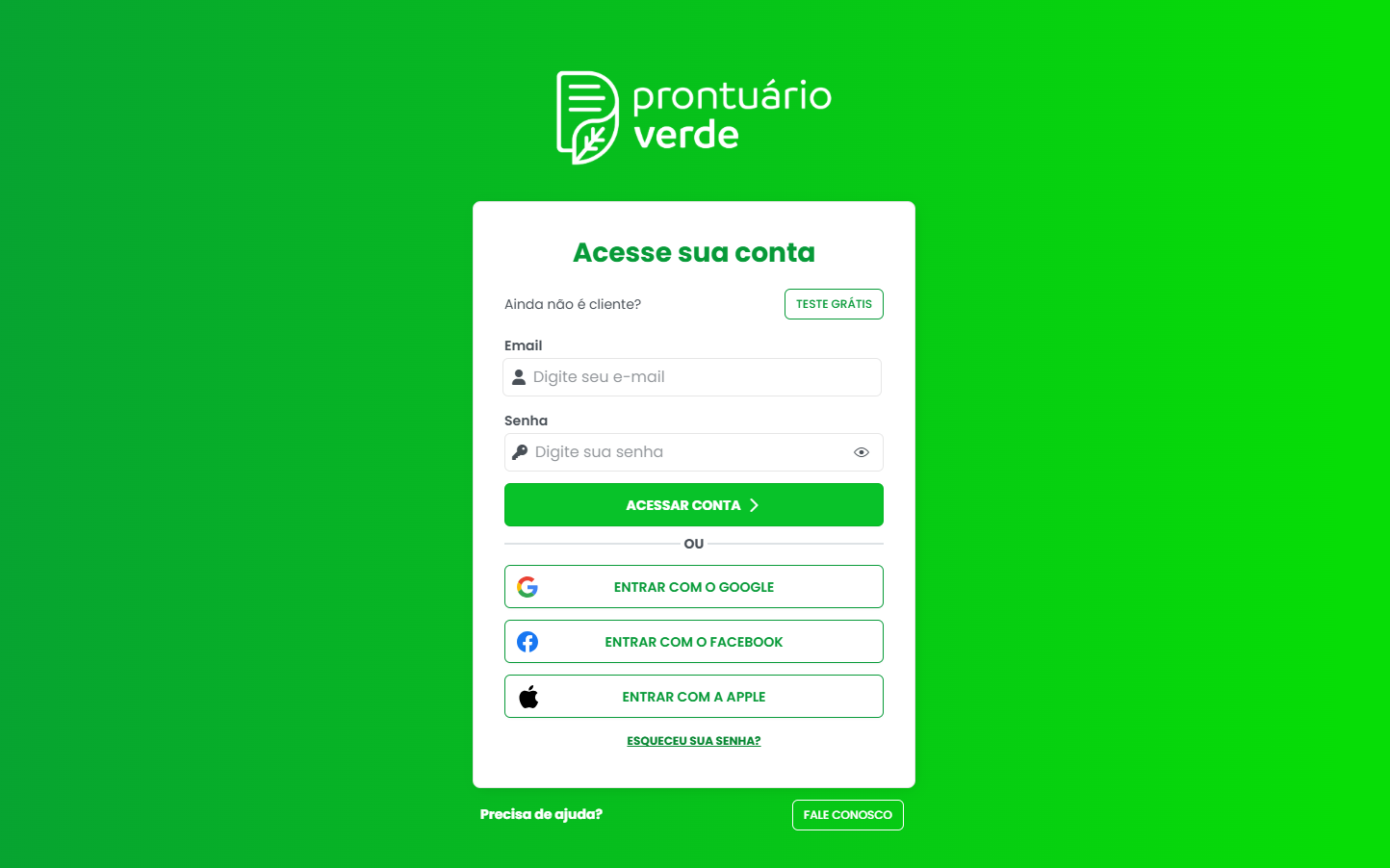 Essas opções permitem que você acesse o Prontuário Verde sem precisar digitar suas credenciais, o que agiliza o processo de login. Ao escolher uma dessas alternativas, o Prontuário Verde utiliza o sistema de login da plataforma selecionada para autenticar sua conta de forma segura.